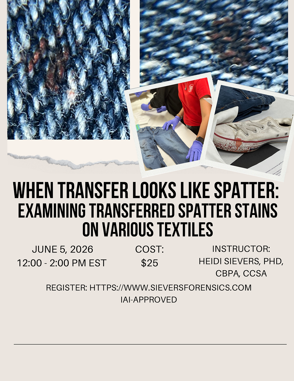 In a special collaboration with GAP Science, Dr. Heidi Sievers has brought you the Bloodstain Pattern Identification and Interpretation e-Course. Self-paced and packed with BPA knowledge. Whether you are a bloodstain novice or have been working bloody scenes for years, this course is perfect to reinforce fundamentals. Click below for more information and to join us!